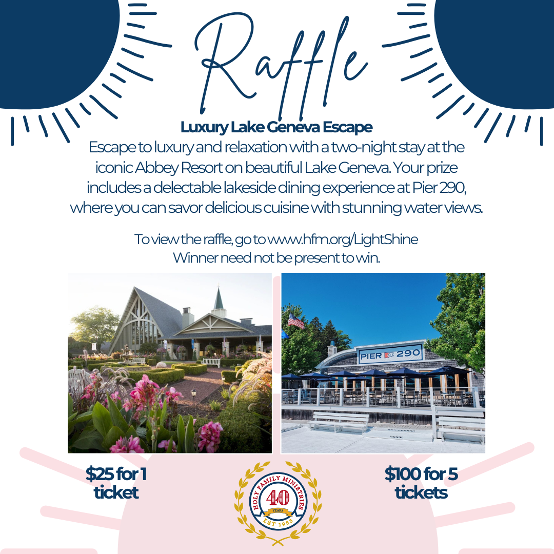 We're holding a special raffle for a Luxury Lake Geneva Escape, and you don't need to attend the event to win. This means everyone can participate and help us reach our fundraising goals!